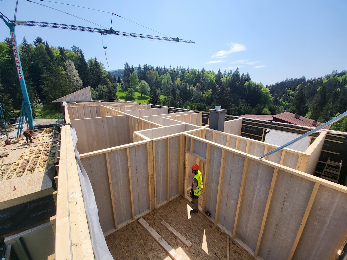 Ve spolupráci s našim dlouholetým partnerem firmou Strechy 92 s.r.o. (https://www.strechy92.sk/) jsme realizovali jako subdodavatel zakázku nástavby 4 podlaží hotelu Čertov, v krásném prostředí obce Lazy pod Makytou (https://www.certov.eu/sk/). Na finální podobu se můžete podívat v tomto albu. A proč se rozhodl investor pro řešení právě na bázi dřevostavby?