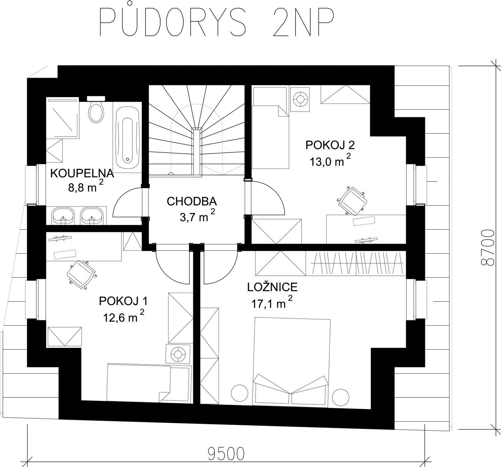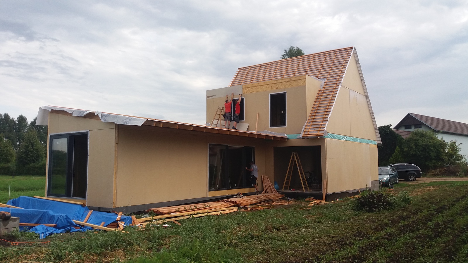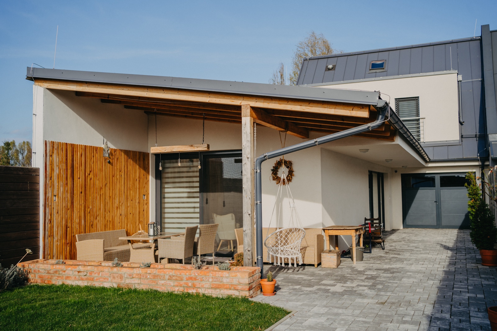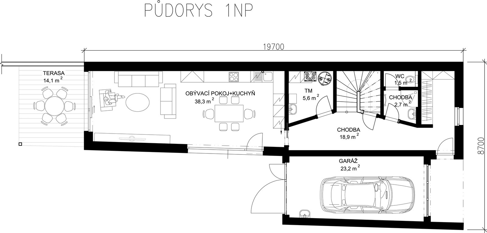 Rodinný dům v Miloticích. Dům s garáží, se třemi ložnicemi a velkým obývacím pokojem s kuchyní. Celkem 152 m2 užitné plochy.
