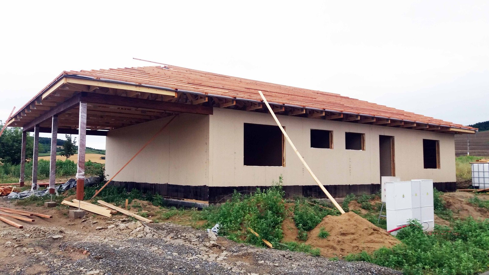 Objekt je řešen jako dřevostavba, s rámovou nosnou konstrukcí s difuzně otevřenou skladbou obvodového pláště. Pod nosné konstrukce je použitý dubový práh a u nenosných XPS polystyrén o tloušťce 40mm.