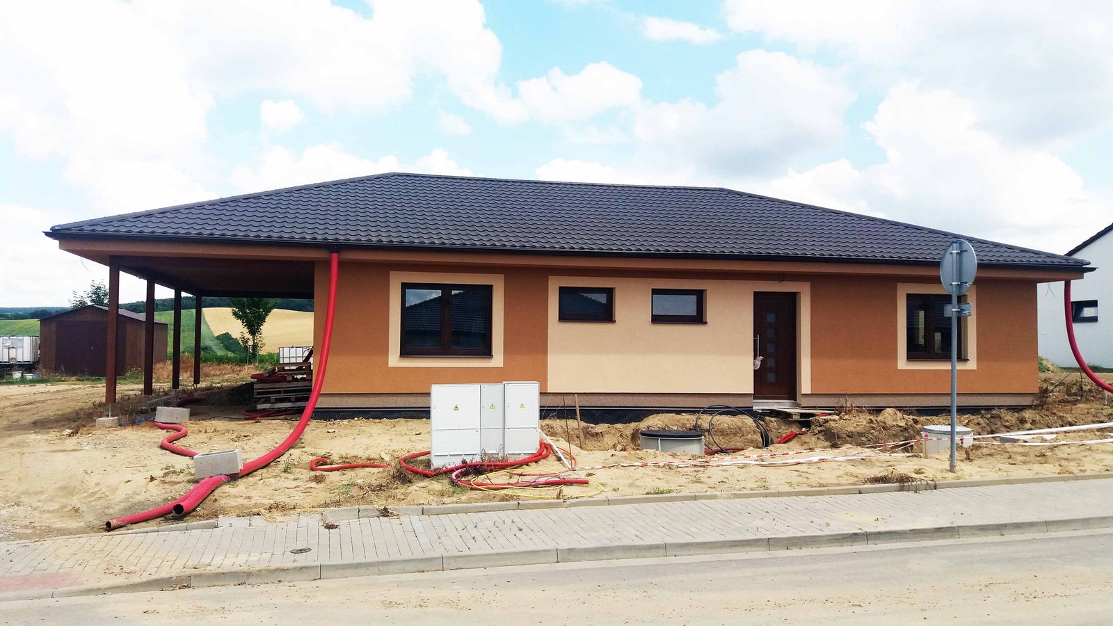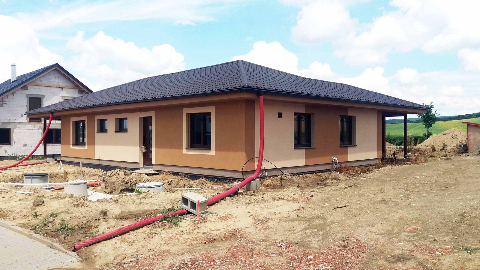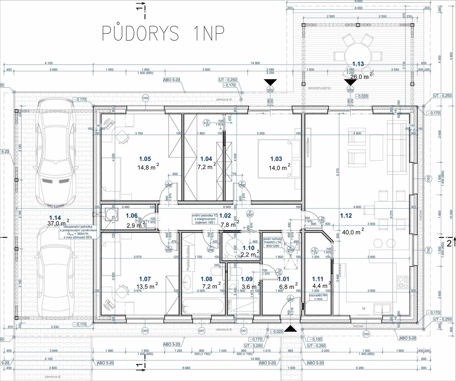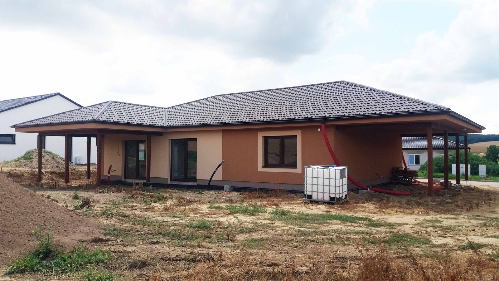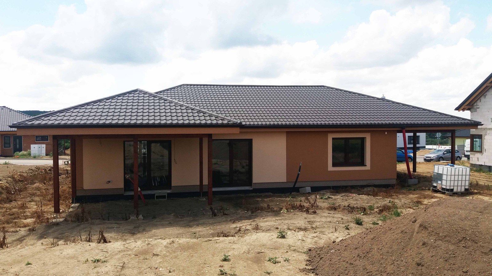 Novostavba RD je řešena v nově zastavované lokalitě Věteřov. Navržený dům je samostatně stojící, jednopodlažní, nepodsklepený, obdélníkového půdorysu s valbovou střechou, o velikosti 4+kk. Střecha je přetažená nad terasu a garážové stání.